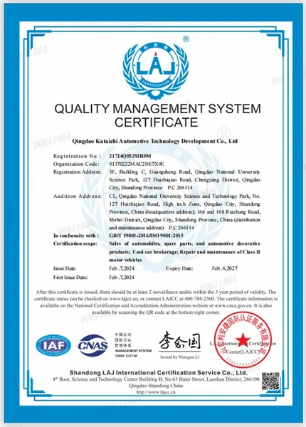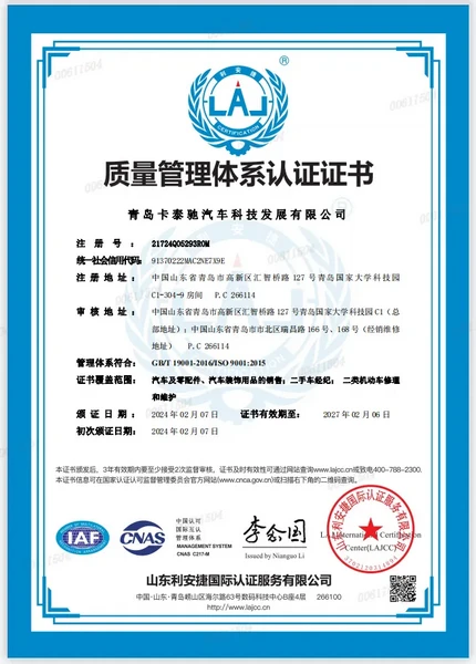 Компания CARtech стала первой компанией в индустрии подержанных автомобилей на территории Китая, получившей сертификат системы менеджмента качества для всего процесса работы с клиентом и продажи автомашин. Эта сертификация ISO включает в себя систему менеджмента качества предприятия на всех этапах, включая спрос клиентов, проектирование и разработку, производство, инспекцию, продажи и поставку автомашин.